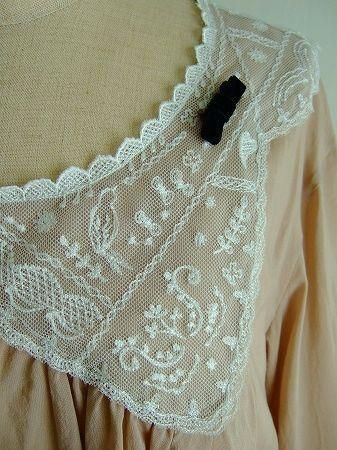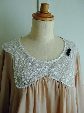 color ピンクベージュ、オフホワイト、素材 テンセル100%、(レース部分)ナイロン100%、made in China、size 38、着丈60cm、バスト100cm、袖丈57cm(切替しより51cm)、肩幅38cm、ベロアのリボンにピンが付いており取り外し可能です。裾に同色の糸でドット刺繍が施されています。