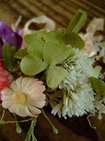 散歩道に咲いているしろつめ草・クローバー・すみれ・レンゲ草・なずな・ヒメジョンなどの素朴なお花をブーケにして下さいました。きれいなお色のとってもかわいいコサージュです。