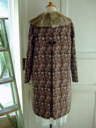 color ブラウン、素材 コットン66%、キュプラ34%、(裏地)ポリエステル100%、(襟)ラビットファー、made in China、size 38、着丈93cm、バスト98cm、袖丈55cm、肩幅38cm、※ラビットファーの襟はボタンで留まっております為、取り外しが可能です。コートはノーカラーのデザインとなっております。