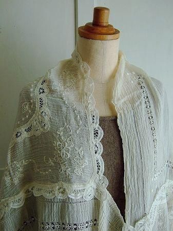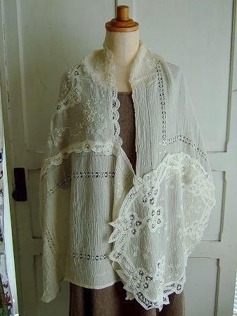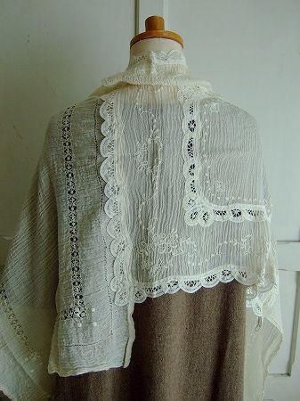 color アイボリー、素材 カシミヤ55%、シルク45%、made in China、size 幅45〜60×166cm、※アンティークドイリーのようなデザインのクロスが4枚パッチワークされております。
