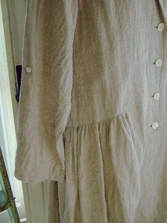 color ナチュラル、素材 Linen100%、size 38、着丈98cm、バスト98cm、袖丈59cm、肩幅38cm、※裏地は付いておりません。起毛加工が施されております。