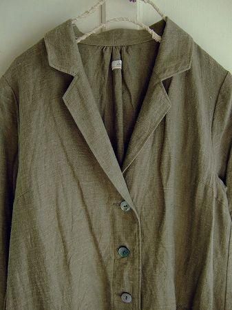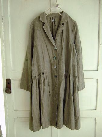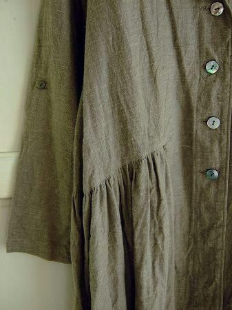 color ベージュ、素材 Linen100%、size 38、着丈98cm、バスト98cm、袖丈59cm、肩幅38cm、※裏地は付いておりません。起毛加工が施されております。