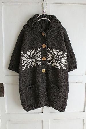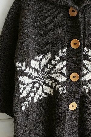 color チャコール(ブラウン)、オフホワイト、素材 wool100%、made in PERU、size 着丈68cm、バスト88cm、袖丈34cm、肩幅38cm