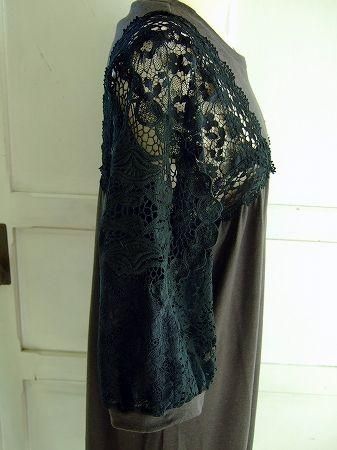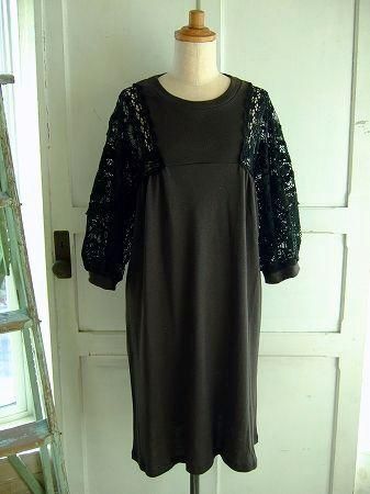 color チャコール、ブラック、素材 コットン40%、レーヨン40%、ウール20%、(レース部分)コットン、ナイロン、made in Japan、size F、着丈92cm、バスト105cm、袖丈45cm、肩幅38cm、※裏地は付いておりません。