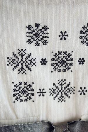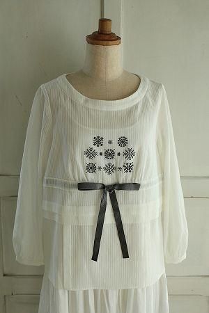 color オフホワイト、(刺繍)ブラック、素材 cotton83%、wool17%、made in China、size 38、着丈56cm、バスト98cm、袖丈54cm、肩幅38cm