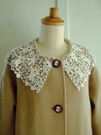 color ベージュ、アイボリー、素材 ウール90%、ナイロン10%、(裏地)ポリエステル100%、(襟)コットン100%、made in China、size 38、着丈89cm、バスト100cm、袖丈55cm(切替しより44cm)、肩幅38cm、※レースの襟はボタンで留まっております為、取り外しが可能です。レースの付け襟襟を外しますとノーカラーのデザインとなっております。ヘリンボン生地を使用しております。