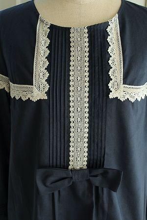 color ネイビー、アイボリー、素材 cotton100%、(レース部分)cotton100%、made in China、size 38、着丈57、バスト100cm、袖丈55cm、肩幅38cm、※リボンはブローチになっておりますので取り外しが可能です。