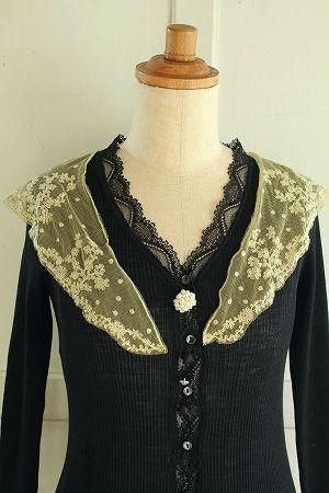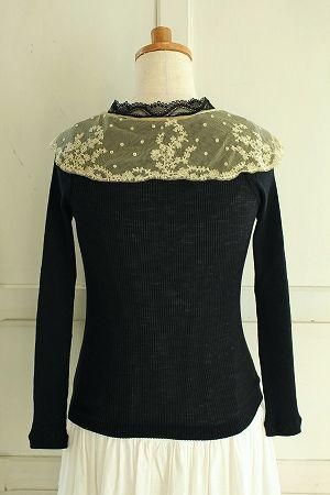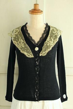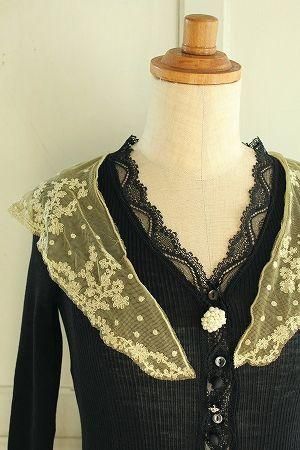 color ブラック、ベージュ、素材 ウール65%、シルク35%、made in France、size F、着丈52m、バスト62cm、袖丈49cm、肩幅38cm※フランスのEMO社製のインナーをリメイクしております。チュールレースは縫い留まっております為、取り外しが不可となります。収縮する素材です。