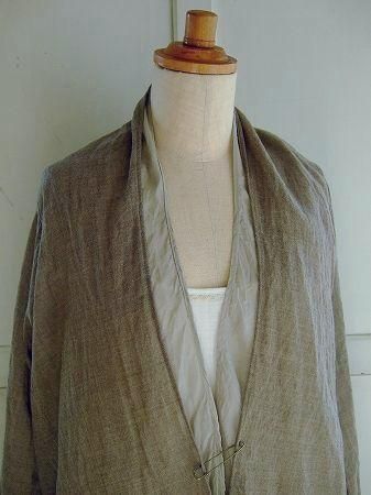 color モカ杢×グレージュ、素材 ウール83%、ナイロン17%、(配色生地) キュプラ100%、size 38、着丈60か〜78cm(サイドが長め丈となっております。)、バスト フリー、袖丈60cm(切替しより55cm)、肩幅38cm、※フロント部分は異素材の生地が2重に施されております。ショールピン付き。