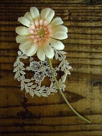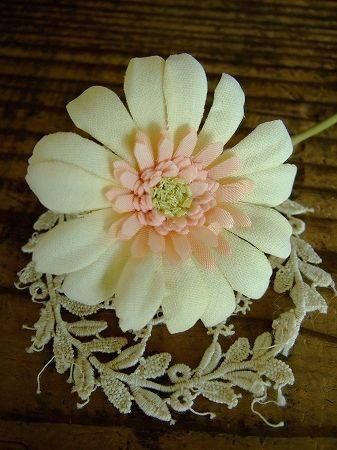 color クリーム×ピンク、グリーン、素材 コットン、真鍮、made in JAPAN、size (ガーベラ)直径6.5cm、(全長)15.5cm