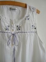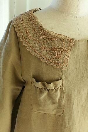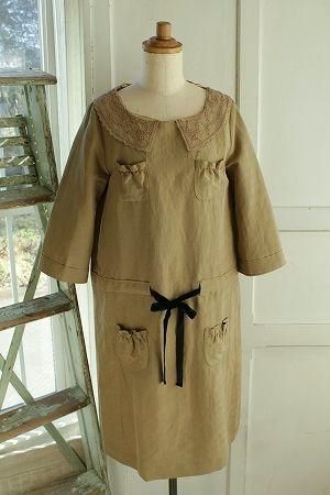 color ベージュ、素材 リネン67%、コットン33%、(チュール襟)ポリエステル100%、made in China、size 38、着丈94cm、バスト96cm、袖丈43cm、肩幅38cm、※チュールレース襟はボタンで留まっております為、取り外し可能となります。裏地は付いておりません。