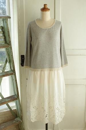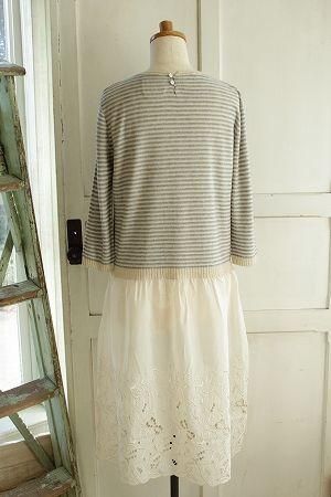 color ブルーグレー×アイボリー、(スカート部分)アイボリー、素材 (トップニット部分)レーヨン70%、ウール20%、リネン10%、(スカート部分)コットン75%、シルク25%、(ペチコート)コットン75%、シルク25%、made in China、size 38、着丈110cm(トップ51cm)、バスト98cm、袖丈46cm、肩幅38cm、※セパレートタイプのペチコート(着丈43cm)付きです