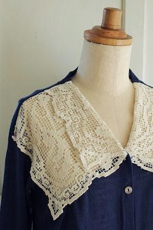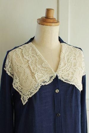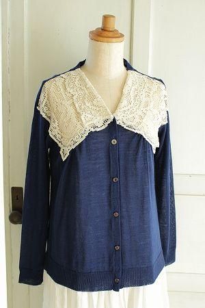 color ネイビーブルー、アイボリー、素材 wool100%、(レース部分)cotton100%、made in Japan、size F、着丈60cm、バスト98cm、袖丈60cm、肩幅38cm、※裏地は付いておりません。