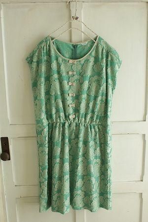 color グリーン、ベージュ、素材 ナイロン58%、レーヨン42%、(裏地)ポリエステル100%、made in China、size 38、着丈92cm、バスト110cm、袖丈10cm、肩幅38cm、※背中ファスナー付き。