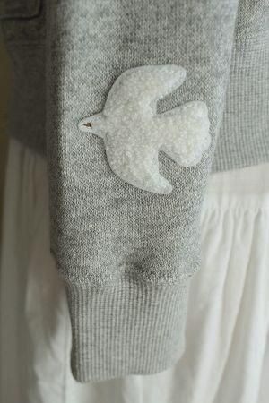 color 杢グレー、素材 コットン100%、(リブ)コットン95%、ポリウレタン5%、made in China、size 38、着丈52cm、バスト86cm、袖丈57cm、肩幅38cm、※左袖口部分にコトリのワッペンが付いております。