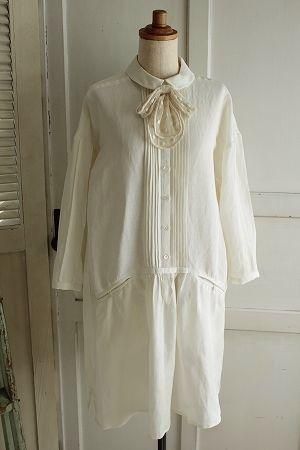 color オフホワイト、アイボリー、素材 レーヨン52%、リネン48%、(タイ)ナイロン100%、made in Japan、size F、着丈90m、バスト106cm、袖丈51cm(切替しより38cm)、肩幅38cm、※レースネクタイはボタンで留まっております為、取り外しが可能です。