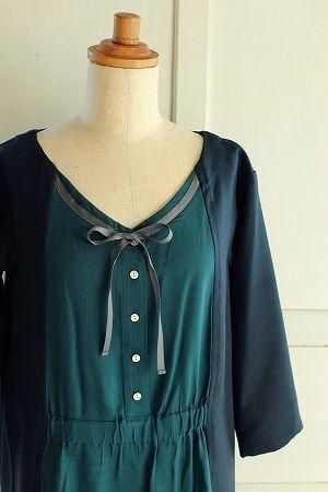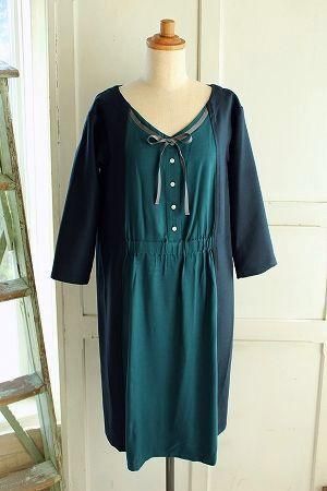 color ネイビー、グリーン、素材 ウール100%、(配色)レーヨン100%、size 38、着丈94cm、バスト96cm、袖丈46cm(切替しより43cm)、肩幅38cm、※裏地は付いておりません。グリーンの配色ウエスト部分にゴムが入っております。