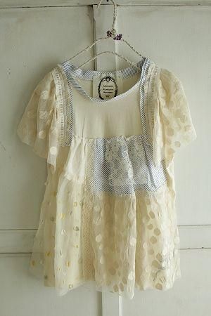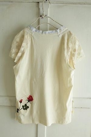 color アイボリー、イエロー×ミント、素材 コットン100%、(別地)その他、made in Japan、size F、着丈59cm、バスト95cm、袖丈16cm、肩幅38cm、※ノースリーブのカットソー地にドット柄のチュール袖が施されてています。