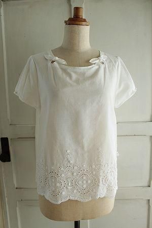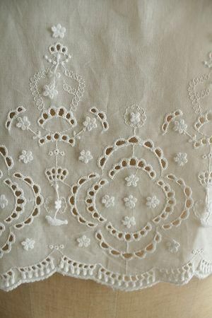 color オフホワイト、素材 コットン100%、(刺繍糸)コットン100%、made in China、size 38、着丈55cm、バスト100cm、袖丈15cm、肩幅38cm、※裾部分には縫い留まっていないゆらゆら揺れるお花とコトリのレースモチーフが施されています。