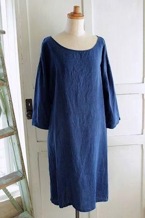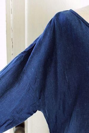 color インディゴブルー、素材 Linen100%、size 38、着丈101m、バスト115cm、袖丈50cm(切替しより35cm)、肩幅38cm、※裏地は付いておりません。