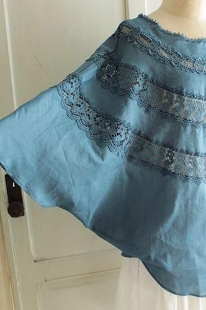 color ブルー、素材 リネン100%、(レース)コットン50%、ポリエステル50%、made in CHINA 、size 38、着丈64cm、バスト フリー、袖丈43cm、肩幅38cm、※裏地は付いておりません。
