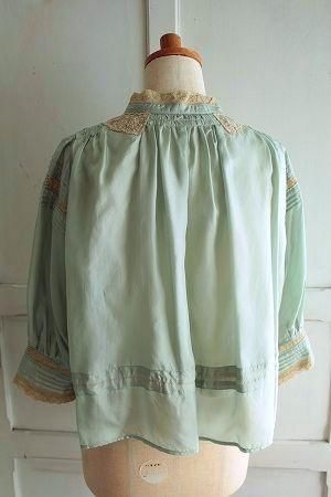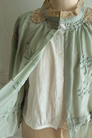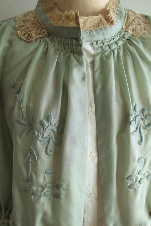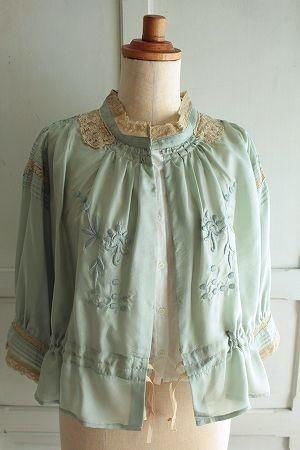 color ミント、オフホワイト、素材 Silk100%、(裏地 cotton100%)、made in China、size F、着丈51cm、バスト132cm(インナーブラウスバスト98cm)、袖丈42cm、肩幅38cm、※シルクのブラウスにフロントにボタンの付いたノースリーブのブラウス(裏地)が施されており重ね着しているようなデザインとなっております。首周りで縫い留まっております為、取り外しは不可となります。シルクブラウスのフロント部分は鍵ホック5つで留めて頂くデザインとなっております。
