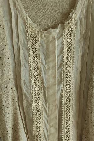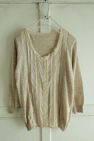color 杢ベージュ、アイボリー、素材 cotton100%、made in Japan、size F、着丈56cm、バスト90cm、袖丈47cm、肩幅38cm、※フロント部分は鍵ホック(16個)で留めて頂くデザインとなっております。首元にリボンが施されています。