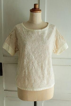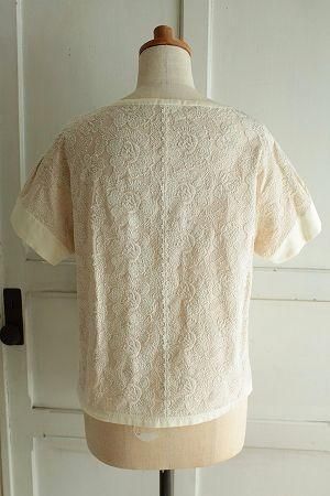 color ピンク、(刺繍)アイボリー、素材 コットン100%、(刺繍糸)レーヨン45%、コットン38%、リネン17%、(別布)コットン55%、シルク45%、(レース部分)コットン100%、made in China、size 38、着丈54cm、バスト96cm、袖丈23cm(切替しより14cm)、肩幅38cm※背中のセンター部分にフラワーモチーフのレースが施されてています。