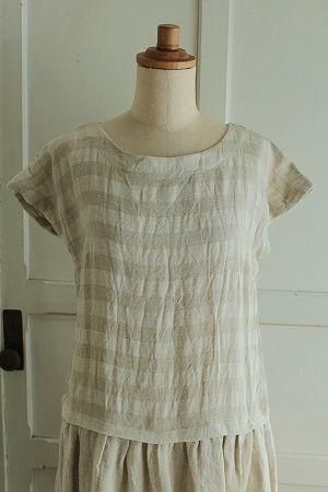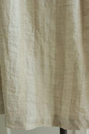 color ナチュラルベージュ×オフホワイト、素材 Linen100%、size 38、着丈94m、バスト92cm、袖丈14cm、肩幅38cm、※裏地は付いておりません。トップとスカートは同生地ですが、生地の使用向きを変えており、トップはボーダー柄、スカートはストライプ柄となります。