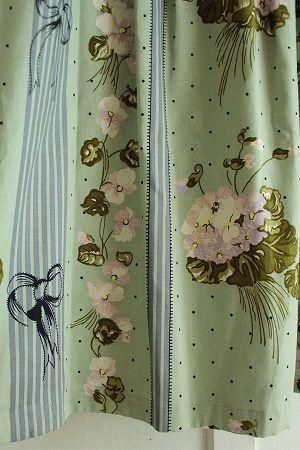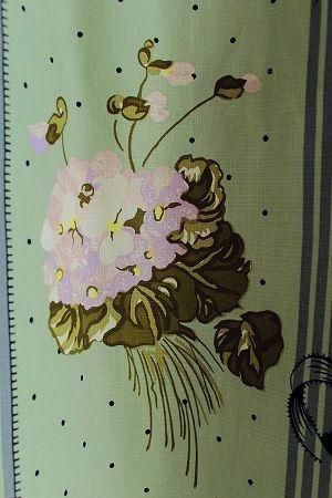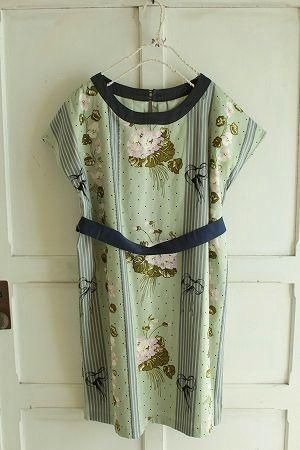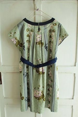 color グリーン、素材 コットン100%、(別布)コットン100%、(裏地)ポリエステル100%、made in Japan、size F、着丈90cm、バスト108cm、袖丈15cm、肩幅38cm、※ベルトはスナップボタンで留めて頂くデザインとなっております。