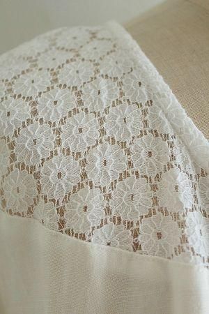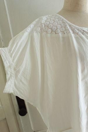 color オフホワイト、素材 リネン55%、レーヨン45%、(レース)コットン75%、ナイロン25%、made in Japan、size 38、着丈82m、バスト150cm、袖丈22cm、肩幅38cm、※裏地は付いておりません。身幅・アームホールが広くドルマンスリーブのゆったりシルエットに仕上げられています。