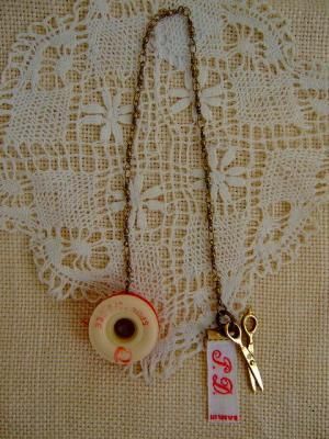 チェーンタイプのブックマーカーです。イニシャルテープ・・・アンティーク。糸(糸の色レッド)・・・アメリカアンティーク。はさみ、チェーン、その他・・・現行品。