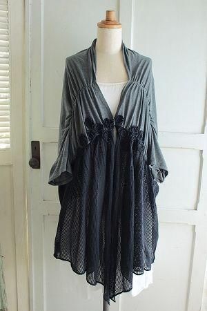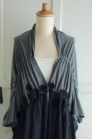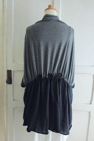 color チャコール×ネイビー、素材 (ニット部分)リネン55%、コットン45%、(カットソー部分)ポリエステル65%、コットン35%、made in China、size 38、着丈80cm(フロント108cm)、バスト フリー、袖丈50cm、肩幅38cm、※首元から袖にかけてゴムが入っております。フロント部分はスナップボタン(1つ)で留めて頂くデザインとなっております。ショールを羽織っているようなシルエットに仕上げられています。