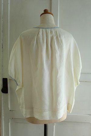 color アイボリー、ブルー、素材 Linen100%、(別布 cotton100%)、made in China、size F、 着丈59cm、バスト125cm、袖丈30cm、肩幅38cm、※身幅が広くドルマンスリーブのゆったりシルエットに仕上げられています。