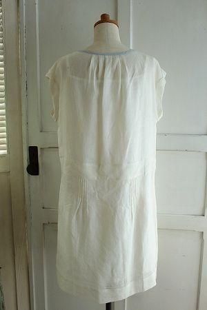 color アイボリー、ブルー、素材 Linen100%、(別布 cotton100%、アンダードレス アセテート100%)、made in China、size F、 着丈91cm、バスト103cm、袖丈9cm、肩幅38cm、※セパレートタイプのキャミワンピースのアンダードレス付きです。折り返した袖口にスカラップが施されています。