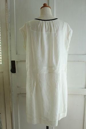 color アイボリー、ベージュ、素材 Linen100%、(別布 cotton100%、アンダードレス アセテート100%)、made in China、size F、 着丈91cm、バスト103cm、袖丈9cm、肩幅38cm、※セパレートタイプのキャミワンピースのアンダードレス付きです。折り返した袖口にスカラップが施されています。