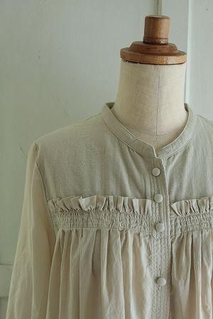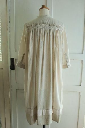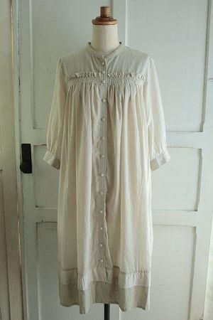 color ベージュ、素材 cotton100%、(別布 cotton75%、silk25%)、made in Japan、size F、 着丈100cm、バスト103cm、袖丈40cm、肩幅38cm、※裏地は付いておりません。4種類の生地がパッチワークされています。