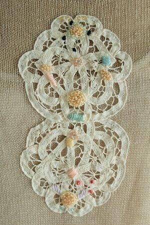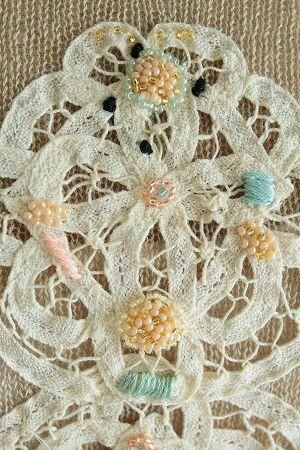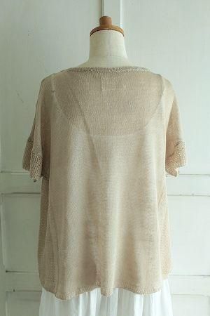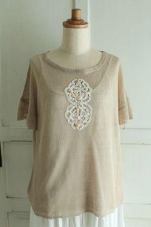 color ベージュ、素材 Linen100%、(レースモチーフ)cotton100%、made in China、size 38、着丈57cm、バスト102cm、袖丈24cm、肩幅38cm、※袖口とサイド部分は異なる編地が施されています。