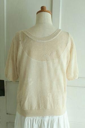 color アイボリー、素材 cotton70%、Linen30%、made in Japan、size 38、着丈51cm、バスト98cm、袖丈30cm、肩幅38cm、※コトリモチーフの飾り編みが施されています。
