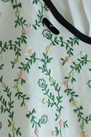 color オフホワイト、(刺繍)グリーン、ピンク、イエロー、素材 コットン85%、リネン15%、(刺繍糸)レーヨン100%、made in Japan、size 38、着丈55cm、バスト96cm、袖丈12cm、肩幅38cm