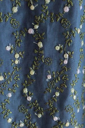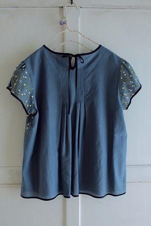 color ブルー、(刺繍)グリーン、ピンク、イエロー、素材 コットン85%、リネン15%、(刺繍糸)レーヨン100%、made in Japan、size 38、着丈55cm、バスト96cm、袖丈12cm、肩幅38cm