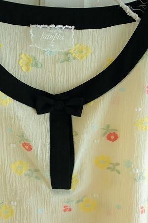 color アイボリー、(パイピング)ブラック、素材 コットン96%、ポリエステル4%、(別布1)ポリエステル100%、(別布2)コットン55%、シルク45%made in Japan、size 38、着丈55cm、バスト92cm、袖丈11cm、肩幅38cm、※首元リボンの下にスナップボタンが1つ付いております。ドビージャガード織りが施されたhaupiaさんのオリジナル生地となります。