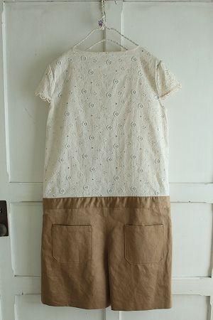 color アイボリー、キャメル、(刺繍)ミント、素材 コットン100%、(刺繍糸)レーヨン100%、(レース部分)コットン100%、(パンツ)リネン50%、コットン50%、made in Japan、size 38、着丈90cm(トップ48cm、パンツ42cm、股下13.5cm)、バスト90cm、袖丈11cm、肩幅38cm、※トップのフロント部分には隠しボタン、パンツにはファスナーが施されております。