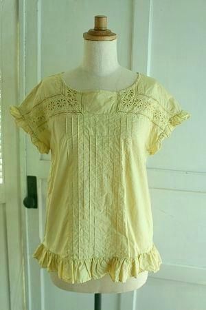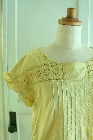 color イエロー、素材 コットン100%、made in Japan、size 38、着丈59cm、バスト93cm、袖丈15cm、肩幅38cm、※こちらは製品染めが施されております。