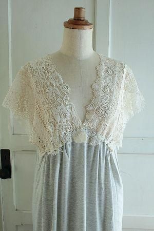 color グレー、アイボリー、素材 コットン50%、レーヨン50%、(レース)コットン、ナイロン、made in Japan、size F、着丈95cm、バスト88cm、袖丈18cm、肩幅38cm、※裏地は付いておりません。フロントのレースとカットソーの切替し部分にゴムが入っております。