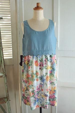 color ブルー、オフホワイト、素材 ポリエステル65%、レーヨン35%、(別布)コットン54%、テンセル32%、リネン14%、(裏地)ポリエステル100%、made in Japan、size 38、着丈86cm、バスト93cm、肩幅38cm、※スカートはカットソー素材です。裏地はスカート部分のみとなります。