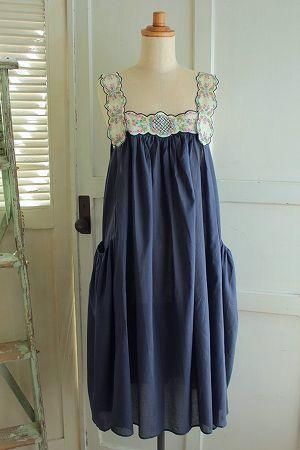 color ネイビー、素材 cotton100%、(別布)cotton100%、made in China、size F、着丈104cm(肩ひも含みます)、バスト110cm、肩幅38cm、※裏地は付いておりません。