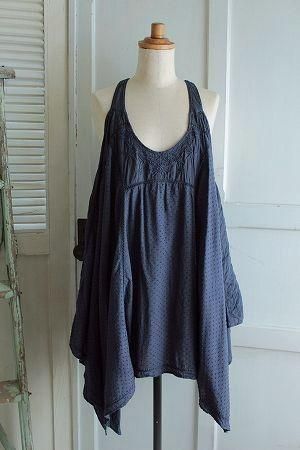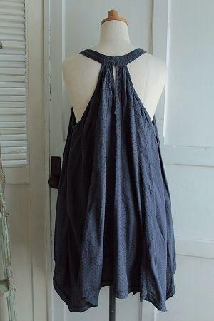 color ネイビー、素材 cotton100%、made in India、size M、着丈78〜95cm、バスト110cm、肩幅38cm、※裏地は付いておりません。背中が大きく開いたデザインとなっております。
