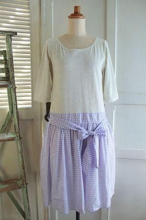 color (トップ)オートミール、(スカート)オフ×パープル、素材 (トップ)コットン100%、(スカート部分) テンセル54%、コットン46%、(裏地) ポリエステル100%、size 38、着丈95m(トップ42cm)、バスト88cm、袖丈34cm、肩幅38cm、※裏地はスカート部分のみとなります。