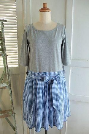 color (トップ)グレー、(スカート)オフ×ブルー、素材 (トップ)コットン100%、(スカート部分) テンセル54%、コットン46%、(裏地) ポリエステル100%、size 38、着丈95m(トップ42cm)、バスト88cm、袖丈34cm、肩幅38cm、※裏地はスカート部分のみとなります。